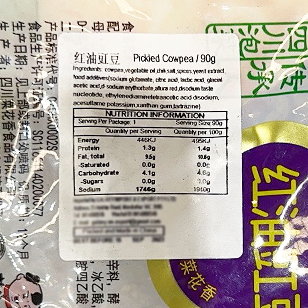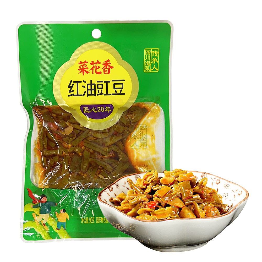 Red Oil Cowpeas with a spicy and flavorful CaihuaXiang seasoning, perfect for adding a kick to your dishes. 90g pack for convenient use.