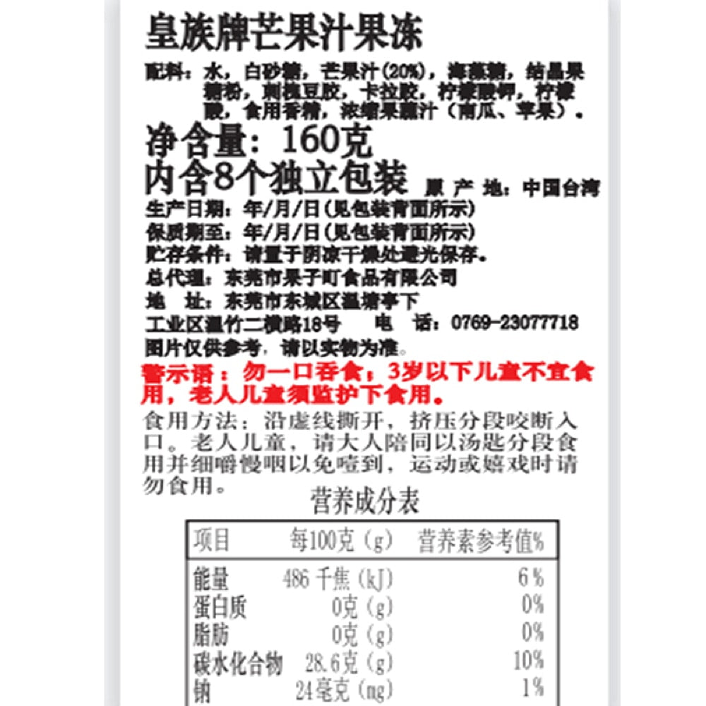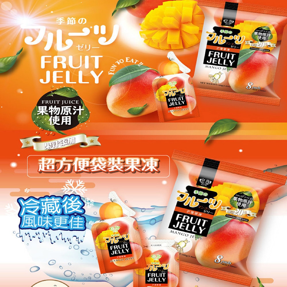 A pack of 8 Royal Family Mango Flavoured Jelly, each weighing 160g, offers a delightful tropical taste. This jelly is a perfect dessert or snack, providing a refreshing and fruity experience.