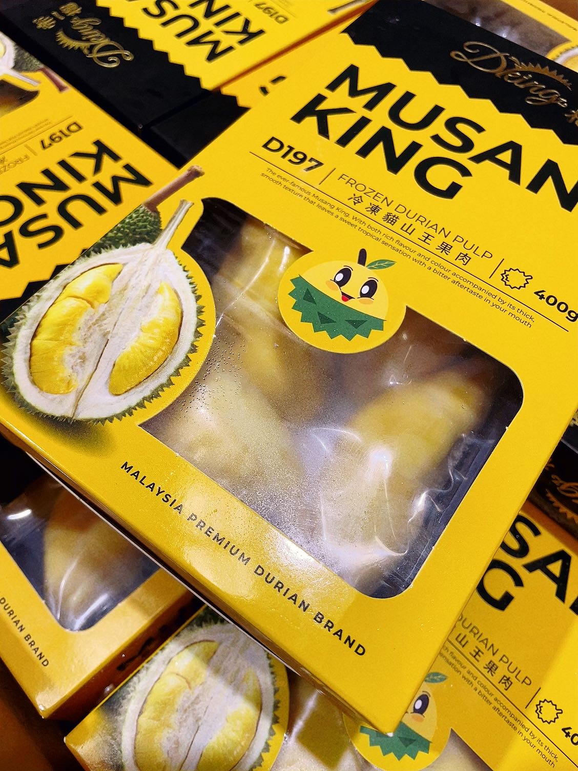 Indulge in the exquisite taste of Dking Frozen Musang King Durian Pulp, packed conveniently in a 400g package.