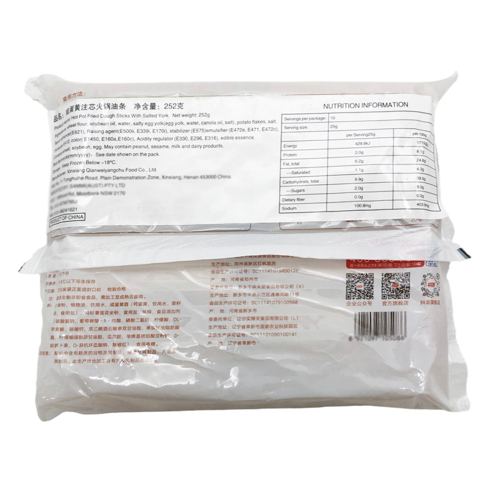 These are 10 pieces of frozen hotpot dough sticks, each filled with a rich salted egg yolk for a unique and savory flavor. At 252g, they are perfect for a quick and convenient hotpot meal.