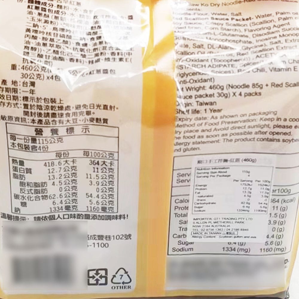 Experience the authentic taste of Miao Kou Handmade Dry Noodles with Red Scallion Flavor. This pack includes 4 servings, each weighing 115g, for a total of 460g.