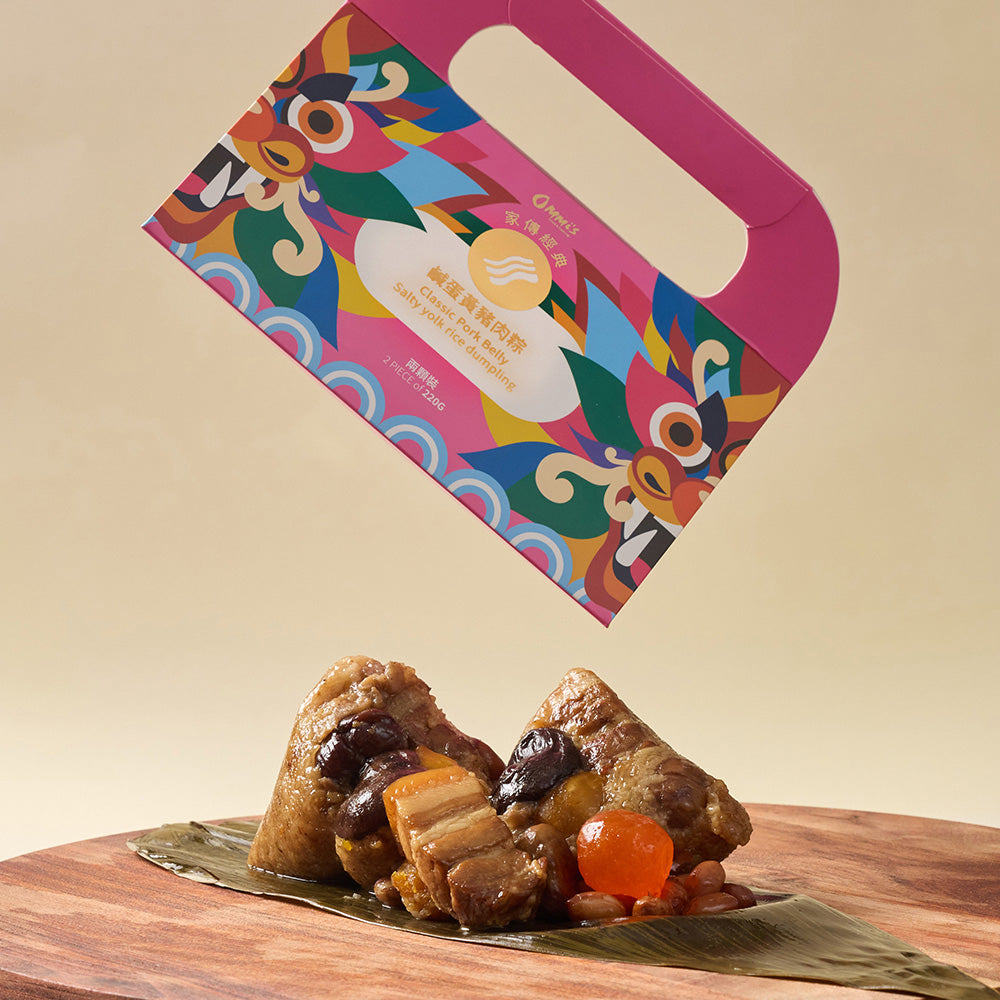 Each pack contains two pieces of rice dumplings, filled with succulent pork belly and salted egg yolk, wrapped in fragrant glutinous rice.