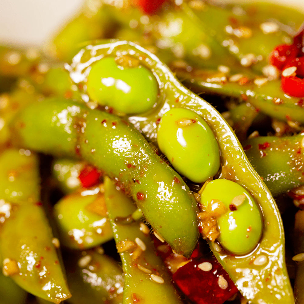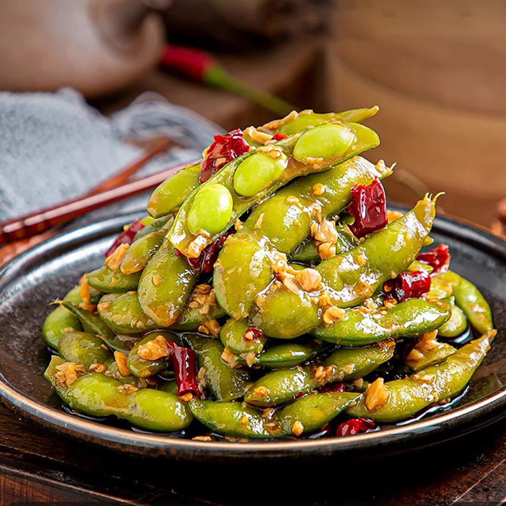 These edamame beans are seasoned with a spicy flavor, making them a perfect snack or side dish.